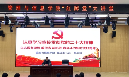 举世瞩目的中国共产党第二十次全国代表大会已于2022年10月22日胜利闭幕。为了进一步提高我院优秀青年学子对党的性质和宗旨认识,了解党的路线、方针和政策,坚定共产主义理想信念,10月28号下午管理与信息学院党总支书记陈兴旺为入党积极分子作题为《认真学习宣传贯彻党的二十大精神——立志做有理想 敢担当 能吃苦 肯奋斗的新时代好青年》专题讲座。陈兴旺书记就党的二十大报告主要精神进行了详细介绍,着重强调了党的二十大报...