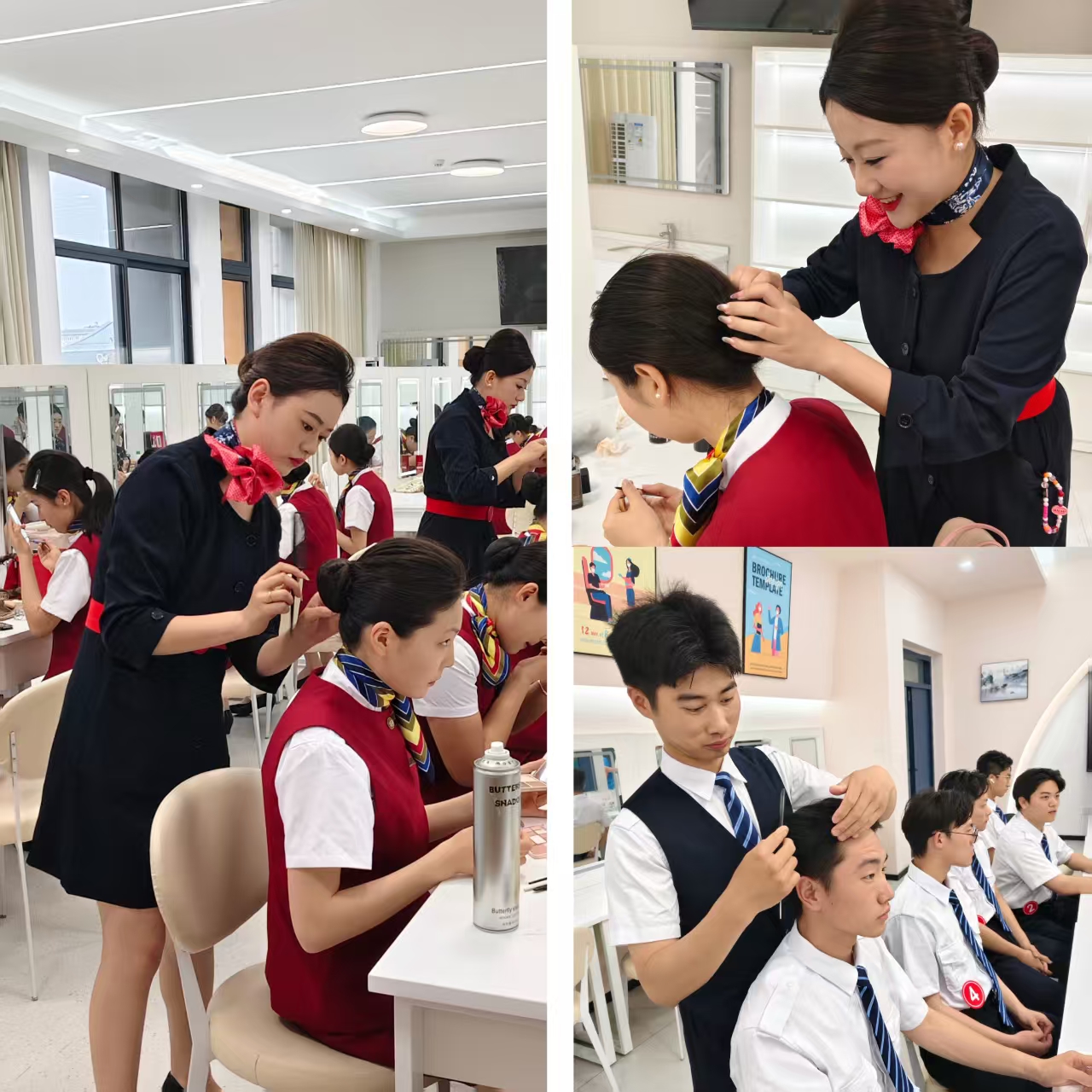 比赛聚焦空乘职业形象的核心要素,从妆容、发型、仪容仪表到服装搭配,全方位考核学生的专业素养。男生需保持发型整洁利落,“前不遮额、侧不掩耳、后不触领”,女生则需将长发盘起梳理整齐,确保发型对称且兼具职业气质。妆容要求自然得体,既体现精致优雅,又避免过度修饰。参赛学生身着标准制服,从站姿、微笑,均以民航服务场景为蓝本进行模拟演练。