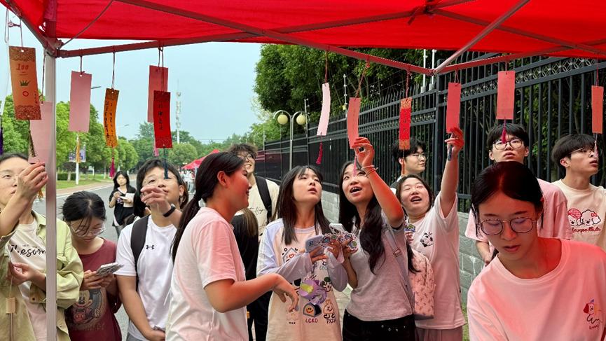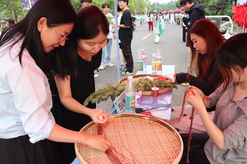 沿途至“百草园”方向,艾条袅袅升腾的药香与漆扇斑斓的纹样交织成趣,投壶箭矢破空的脆响应和着绒花簪娘指尖的灵动。案头绣娘穿针引线,将中草药与锦缎缝进香囊,馥郁芬芳漫过古朴长案;彩绳在巧手中翻飞盘绕,编就五色祥纹,与传统文化的多彩图景共同奏响文化交响。“才华出粽”诗词擂台吸引众多学子驻足,从《楚辞》“浴兰汤兮沐芳”到苏轼“彩线轻缠红玉臂”的吟诵声中,传统文化基因悄然植入青年心田。据统计,开幕式当日参与互动体验的师生达2200余人次,创下历史新高,彰显传统文化的当代吸引力。