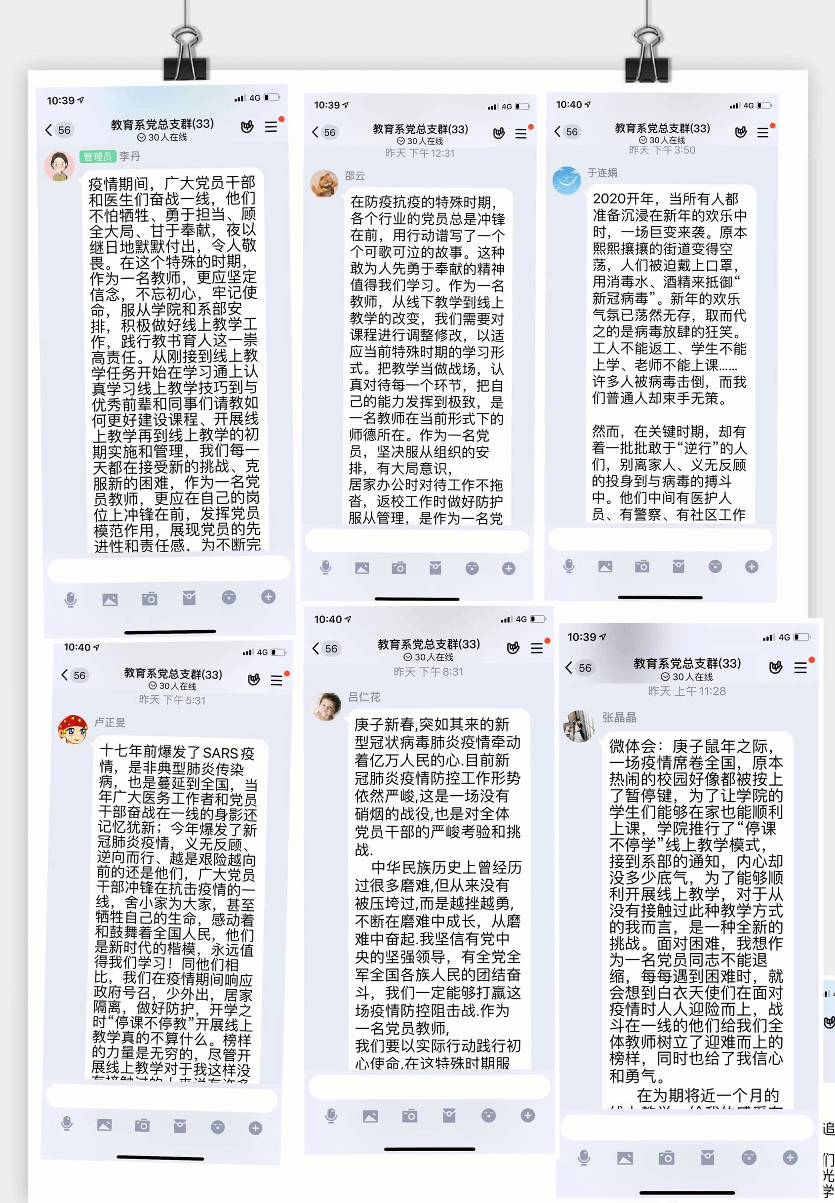 活动后,全体党员围绕党员如何带头积极利用学科和专业优势,做好疫情防控、网络教学工作;运用好抗“疫”历史题材和现实题材,抓住契机讲好“课程思政”,弘扬爱国主义精神;如何在重大任务落实中发挥共产党员先锋模范作用等四个方面展开讨论,每一名党员分别撰写线上“微体会”。党员们深刻认识到,在这个特殊的时期,必须统一思想认识,牢记初心使命,不折不扣、认真贯彻落实好党中央、省委和学院关于疫情防控的决策部署要求,发挥好党员的先锋模范带头作用,积极做好疫情防控工作,要保持学习常态,积极学习现代教育技术,充分发挥党员模范和先锋作用,提高“线上教学”质量,在自己平凡的岗位上发光发热,以实际行动为党旗增色、为党徽添彩,绽放自己更推动团队的提质创优。(文/图:徐立娟)