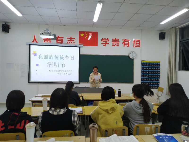 当天下午护理系团总支书记秦海娇老师在b1 102开设了以“我们的节日——清明节”为主题的讲座活动。在讲座中秦老师主要介绍了清明节的由来、传统习俗以及对先烈的缅怀。并且也提出文明祭扫、绿色祭扫的环保观念。最后秦老师希望大家在传承中华民族传统习俗的同时也要发扬优秀的传统美德,号召同学们积极参加网上祭英烈活动,为革命先烈献花,缅怀革命先烈,继承革命遗志,努力学习,报效国家。