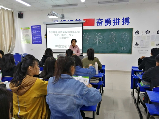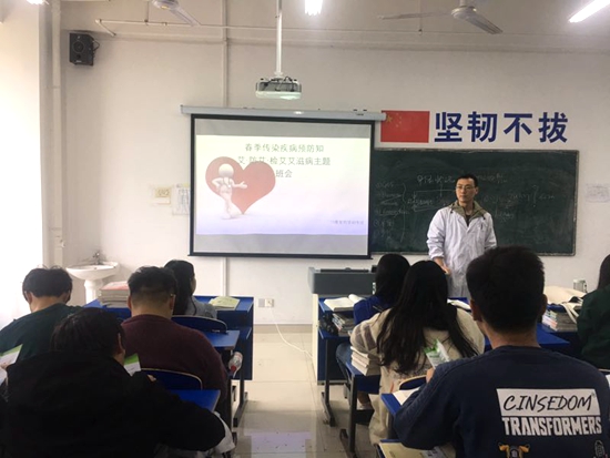 班会课上,各班班主任、辅导员通过多媒体教学,以视频,图片的形式向学生介绍春季常见的传染病的预防以及艾滋病相关知识,对 “什么是春季传染病”、“春季传染病的传播途径”、“春季传染病的预防方法”“、艾滋病的相关知识与预防”等知识进行讲解,并且向同学们传达了预防疾病15字诀:“洗净手、喝开水、吃熟食、常通风、晒衣被”,要求学生在日常生活中要注意个人卫生,养成良好的饮食习惯,做好卫生值日,保持环境清洁,经常锻炼身体,增强身体素质。此外,还总结几种预防艾滋病方法:一是做到洁身自爱、遵守性道德,这是预防经性途径传染艾滋病的根本措施;二是远离毒品;三是不去消毒不严格的医疗机构打针,拔牙、针灸、手术等;四是避免日常工作,生活中沾上伤者的血液;五是不使用未经检验的血液制品,减少不必要的输血。