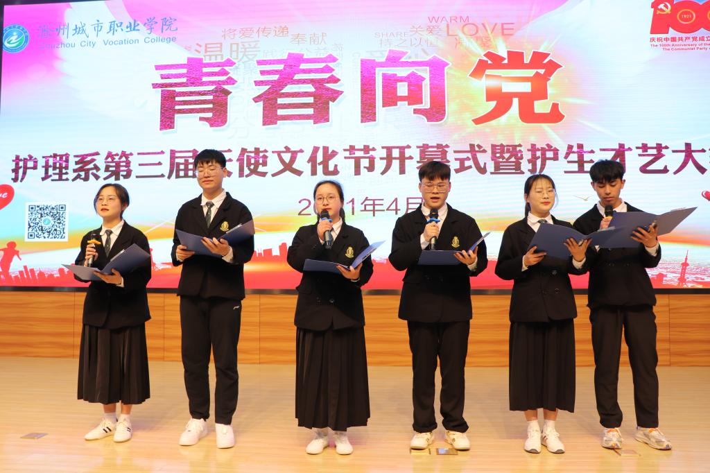 青春向党,使命在肩。为庆祝中国共产党建党100周年,充分展示当代大学生的爱党爱国爱社会主义的深厚情怀,4月14日下午,护理系在学院第二报告厅举办“青春向党”第三届天使文化节开幕式暨护生才艺大赛。通过初赛、复赛的筛选,共有17个节目进入决赛。
