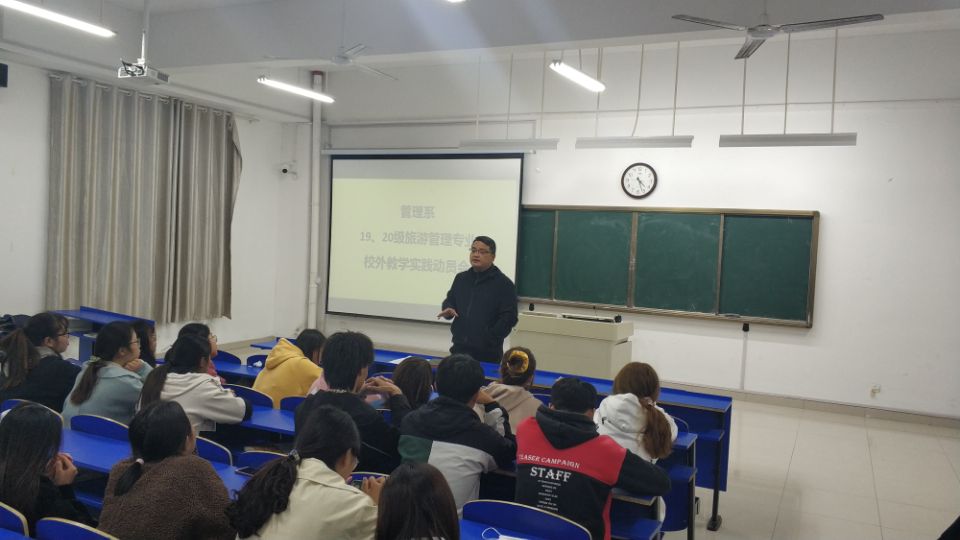 10月21日,管理系召开2021年旅游管理专业教学实践活动动员大会。管理系党总支书记陈兴旺、管理系学管秘书唐静老师、专业课教师高菲和旅游管理专业19级、20级全体学生参加动员大会。大会由旅游管理专业带头人韩峰老师主持。