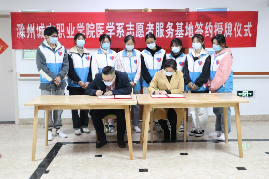 为深入学习贯彻习近平新时代中国特色社会主义思想和党的十九大精神,强化学生社会责任意识、规则意识和奉献意识,弘扬中华民族“尊老、敬老、爱老”的传统美德和“奉献、友爱、互助、进步”的志愿精神。11月25日医学系“医康+”爱心医疗服务队与滁州市安居养老服务有限公司举行志愿服务基地签约授牌仪式。医学系党总支书记吴惠珍、党总支副书记田青青、康复专业带头人高步刚等出席了本次签约仪式。