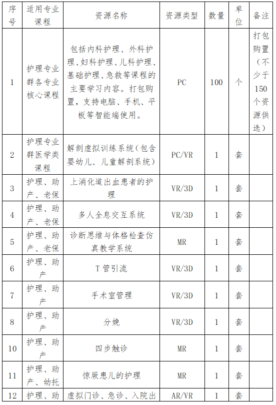 根据教育部《职业教育示范性虚拟仿真实训基地建设指南》的要求,涵盖了沉浸式3D立体虚拟实训中心、虚实结合实训中心、PC端虚拟仿真实训中心以及数智产教研创发展中心。资源主要是根据护理专业群中护理、助产、婴幼儿托育服务与管理、老年保健与管理专业、现代家政服务与管理相关的实训内容进行配套。