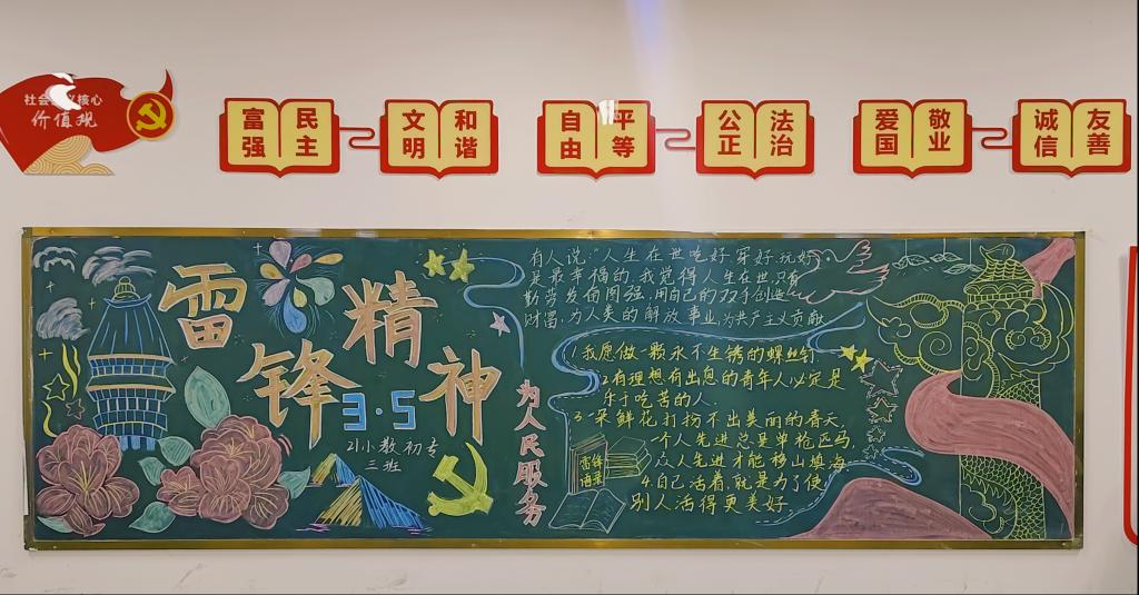 各学院班级围绕雷锋精神精心设计黑板报,将雷锋事迹、名言警句与创意绘画相结合,展现对新时代雷锋精神的理解。此类主题板报形成校园立体化育人场域,有效实现环境育人功能。在“学雷锋”绘画作品比赛中,学生通过画作为媒介重构雷锋助人场景,以书法艺术解码雷锋语录的精神密码,依托剪纸非遗技艺再现精神图谱。形成"艺术阐释-情感共鸣-价值内化"的完整教育链条。