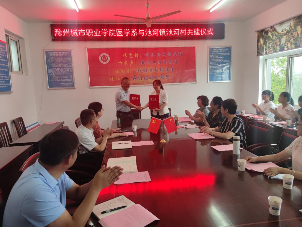 为深入学习贯彻党的十九大精神和十九届二中、三中、四中、五中全会精神,充分发挥高校资源优势,推动产教深度融合,促进创新创业发展,6月18日上午,学院党委书记张志华、医学系党总支书记吴惠珍、系主任毕璧一行前往定远县池河镇开展“党建引领助振兴 校村联建促发展”共建活动,池河镇党委书记程永峰、党委副书记周慧、学院办公室副主任张如清以及池河村党总支党员、医学系总支部委员、学生入党积极分子等相关人员参加本次活动。