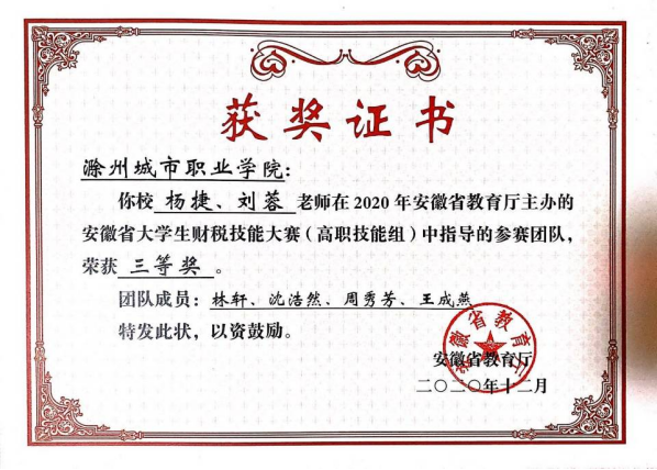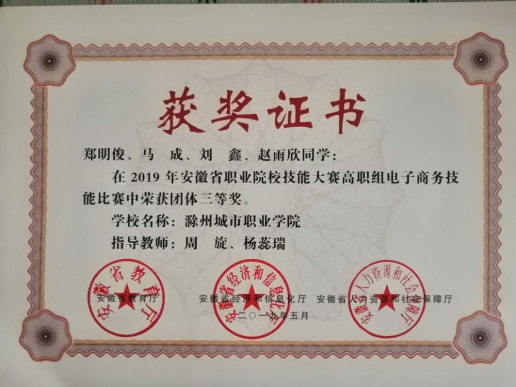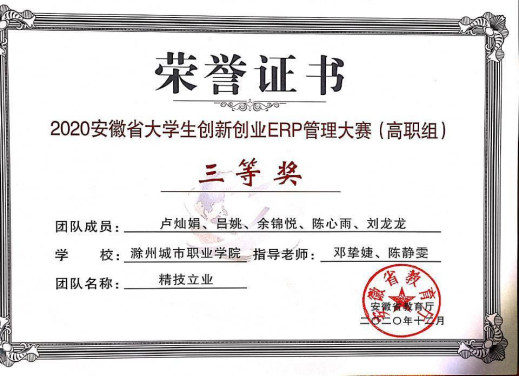 管理与信息学院以能大赛为抓手,全面提升专业建设内涵。“十三五”期间,大数据与会计专业师生在安徽省大学生财税技能大赛多次获二、三等奖;安徽省大学生创新创业ERP管理大赛ERP管理大赛多次获三等奖;电子商务师生在安徽省职业院校电子商务技能比赛多次获三等奖;参加全国大学生市场调查与分析大赛获一等奖1次,二、三等奖多次;参加大学生茶文化创新大赛获团体赛、个人赛一等奖3次,二、三等奖多次;获第九届大学生挑战杯大赛安徽大学生创业计划竞赛铜奖。五年间,学生参加专升本考试,参军入伍等考试中,成绩优异,录取率高。