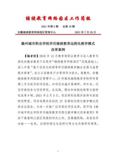 2021年,继续教育学院参加省教育厅指导,省继续教育网络园区组织编写的《高等学历继续教育学习指南》,并作为副主编单位,推动继续教育改革成果运用。2020年底,与安徽开放大学合作的《政府引领 高校联动 构建高职扩招线上教学网络园区服务新模式》获得安徽省线上教学成果奖一等奖。