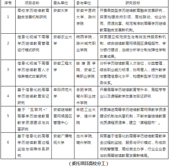 为贯彻落实党的十九大关于“办好继续教育,加快建设学习型社会,大力提高国民素质”的总体要求,教育部职业与成人教育司委托省教育厅在现有“继续教育网络园区”基础上,深入开展基于信息化的高等学历继续教育融合发展与监管服务探索项目。省厅高度重视,制定委托项目实施方案,设立六个方面研究子项目,并列入2019年省教育质量工程重大教学改革项目中。学院与安徽农业大学、皖西学院联合开展教育部职成司委托项目子项目“信息化视域下高等学历继续教育管理运行模式研究”,并已顺利结题。